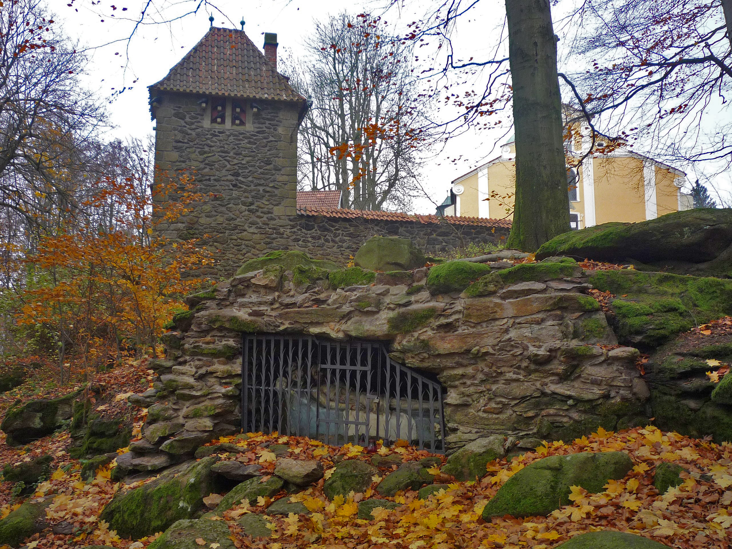 Poblíž kostela se nachází nedokončená stavba tzv. Větrného (havraního) zámku. Podle projektu Kamila Hilberta jej začal roku 1930 stavět sochař Josef Šejnost pocházející z nedalekého Těšenova. Na věži zámku sedí sedm skleněných havranů jako připomínka pohádky o sedmi bratrech zakletých v havrany (nebo také krkavce). Josef Šejnost zde plánoval zřídit muzeum svých medailí, projekt však nebyl dokončen.
